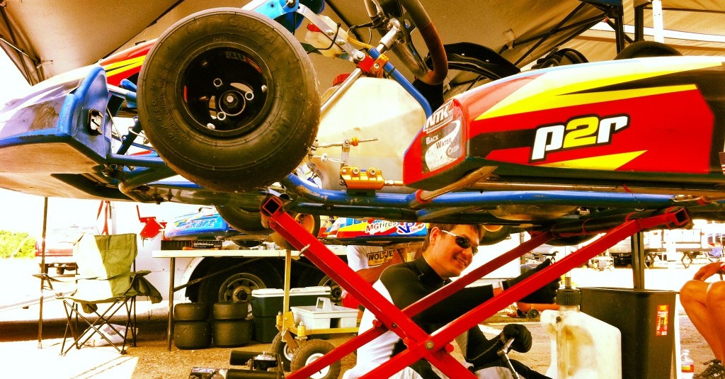 Working under the kartAfter spending a night at a friend of Andre’s place, we completed our journey to Grandsport Speedway and setup our pit spot. Everything got underway pretty fast with us finishing up our registration, unloading and getting ready for our practice sessions. The TPKC organizers had setup multiple sessions so everyone was getting lots of track time! Friday practice was going well with my kart setup seemingly perfect and getting use to the track layout.